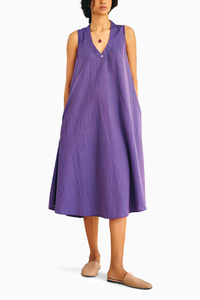Featuring a purple striped shift dress with a V neckline, crafted from breathable soft cotton, this dress is designed for ultimate comfort and relaxation, akin to the feeling of being at home. It includes side seam pockets for added practicality, blending cozy ease with stylish simplicity.