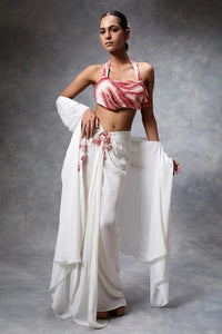 Bustier blouse in signature 3D micro draping embroidery. Halter strap. Paired with a draped skirt in 3D floral burst embroidery. Cape with same embroidery.