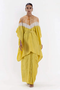 Handwoven saree dyed in lime with our signature shibori detail on the neckline. It comes with an unstitched silk blouse piece and a textile belt for the waist.