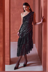 Featuring The Lumiere Black Sequins and Lace Dress by Bohochic's Lumiere Collection. This one-shoulder midi dress blends a shimmering sequin bodice with a lace hem, creating a striking contrast that’s elegant, glamorous, and perfect for evening celebrations.