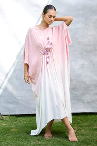 Kaftan dress with front and back gathered detail and micro floral 3D embroidery. Ombre dyed. Comes with a slip.