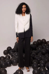 This chic blazer set features a striking black and white design with shoulder pads for a modern silhouette. The elegant pearl & stones detailing along the lapels adds a touch of glamour, while the single-button closure keeps it sleek. Paired with flattering black straight pants, this ensemble effortlessly combines sophistication with contemporary style.