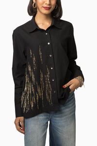 This embellished shirt is our take on party wear. It is tailored for a straight fit and has a classic collar and cuff. It is finished with pearlescent buttons. The gold embroidery catches the light as you move.