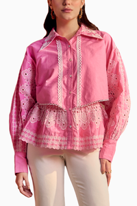Featuring The Pink Cosmos Blouse by Boho Chic, Love Cabo Collection. This beautifully crafted blouse features delicate lace trims and intricate broderie on the sleeves and bottom hem, adding a touch of elegance to any ensemble.