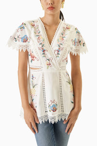 Featuring this beautiful crafted soft cotton blouse featuring pastel embroidery and abundance of lace makes this blouse a heads turning satement. Accessorise with a mini bag and slip on a wedge heel.