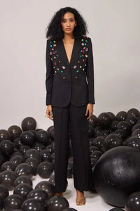 This stylish black blazer set features eye-catching multicolored rhinestone detailing that adds a vibrant touch to its classic silhouette. The blazer, with shoulder pads and a front button opening, boasts full sleeves for a sophisticated finish. Paired with sleek black tapered pants, this ensemble effortlessly combines elegance with modern flair.