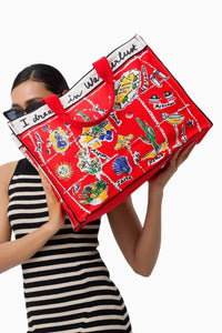The Red Wanderlust Tote Bag is a tribute to the traveler within. Featuring vibrant cities like Gstaad, Aspen, Cali, Rio, and more, it combines style and adventure. Made from cotton canvas, with a chic printed lining, it's perfect for wanderers. Handle with care.