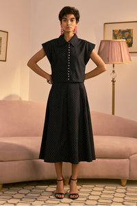 A chic, two-piece ensemble with a vintage-inspired feel. It pairs a tailored, sleeveless button-down shirt with a voluminous, flared midi-skirt, both in a matching dark, patterned material.