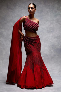 One-shoulder blouse in signature 3D micro draping embroidery with zari threads, seed beads and sequin. Pallu attached on shoulder. Mermaid lehenga with same embroidery. Separate can-can skirt.