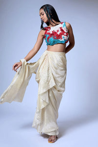 Boat neck blouse in textured beadwork embroidery with seed beads, crystals, French knots etc. Draped skirt with ruffle detailing and embroidery highlights. Paired with draped dupatta with tassels.