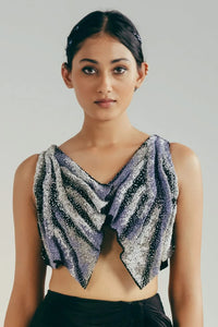 Sculpted bustier in 3D micro-draping embroidery and angular hemline. Centre back hook & eye opening.