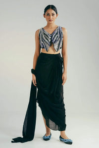 Sculpted bustier in 3D micro-draping embroidery and angular hemline. Centre back hook & eye opening. Draped saree skirt with asymmetric hemline and knot detail. Side seam conceal zipper opening.