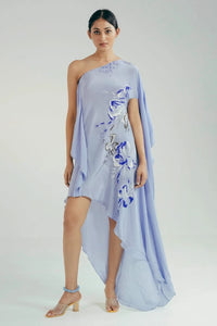 One-shoulder kaftan dress with 3D floral embroidery and asymmetric hemline.