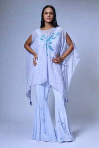 Draped kaftan top with scatter embroidery in beads, sequin and French knots. Tassel details. Comes with slip. Fit and flare pant with embroidery highlights.