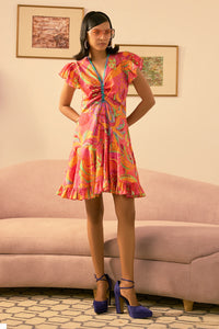 A vibrant, multi-colored mini or knee-length dress featuring a lively abstract floral print. It is styled with playful ruffled cap sleeves and a tiered, flounced skirt for a lively, feminine silhouette.