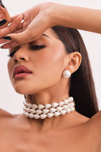 The Drops Pearl Choker in White features a delicate arrangement of lustrous white and soft white pearls, cascading gracefully in a droplet-like design. The contrasting colors create a harmonious and elegant look, with the warm peach tones adding a subtle pop of color against the classic white.