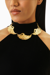 Featuring The Swan Dance Necklet by Studio Metallurgy. This stunning neckpiece, crafted from brass metal with a luxurious gold finish, exudes elegance and sophistication.