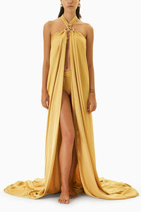 The Trailing Furbelow sarong is a solid monotone elcongated concept sarong. Has gold trim details on both the edges of the piece.