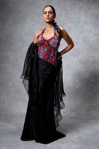 Corset top embroidered in textured beadwork embroidery with seed beads, crystals, french knots etc. Paired with a draped skirt and organza ruffle dupatta.