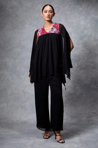 Draped top with yoke embroidered in textured embroidery with seed beads, crystals, french knots etc. V-cut neckline and cape sleeves. Paired with a straight cut flowy pant.