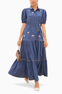 This chic blue shirt dress is a blend of comfort and style, perfect for any casual outing. Crafted from soft, breathable fabric, it features a button-down front and a collar, lending it a structured yet relaxed look. The dress is adorned with heart-shaped motifs that include protective evil eye designs, adding a playful and unique touch. The short puff sleeves enhance its modern appeal, while the tiered skirt provides a flattering silhouette that moves gracefully with every step. Additionally, the dress comes with a simple fabric belt with a gold buckle, allowing you to cinch the waist for a more defined look. Pair this versatile dress with your favorite heels or flats for an effortlessly stylish ensemble.
