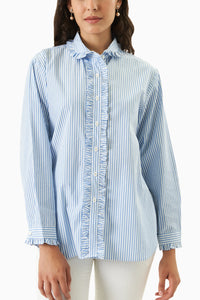 Featuring The Wandering Line Shirt by Trisara, this striped cotton shirt showcases elegant ruffle detailing around the collar and button placket. Designed in classic blue and white stripes with a straight fit, it blends charm with everyday sophistication.
