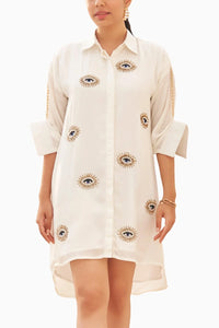 This classic satin shirt dress exudes elegance and sophistication, making it a standout piece for any wardrobe. The luxurious satin fabric drapes beautifully, offering a smooth and flattering silhouette. Adorned with beautiful evil eye motifs, the dress adds a touch of mystique and protection to your look. The gold chain details on the sleeves enhance its opulent design, providing a unique and contemporary edge. Perfect for both casual and formal occasions, this shirt dress is a versatile and stylish addition to your collection.