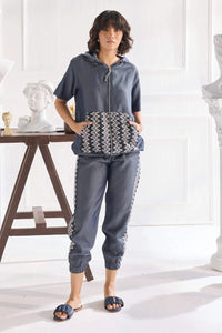 A tensil denim track set featuring a front-zip short sleeves hoodie and jumper pants with chevron print detailing on the top and side of pants.