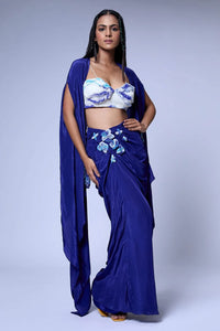 Bustier blouse in our signature 3D micro draping embroidery. Noodle strap. Draped skirt in floral burst micro draping embroidery. Paired with a flowy cape with armhole and in same embroidery.