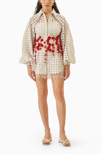 Featuring a chemical lace shirt dress with chantilly lace camisole inside and teamed up with white corset belt with red applique flowers on it.