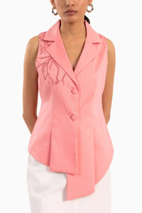 Crafted from crisp cotton satin, this single breasted vest features an asymmetrical silhouette with an off-kilter hem. The cinched-in waist enhances the design, creating a subtle hourglass shape.