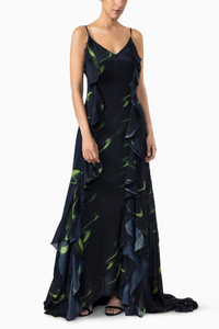 Crafted in fluid silk-blend crepe, this picture-perfect maxi dress is accented by the brand's thousand crescents print. It features a flattering V-neckline, twin spaghetti straps, and waterfall frills flowing through the silhouette, continuing to the asymmetrical hemline.