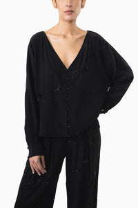 Relaxed-fit silk shirt with a flattering V-neckline, centre-front loop buttons in self-fabric, crisp two-button cuffs, and dropped shoulders. The shirt features our minimal take on 'A Thousand Crescents' embroidery, flowing asymmetrically across the front