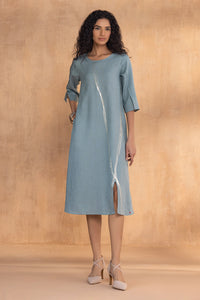 Featuring 100% linen, this ensemble showcases flowy, thread-like lines drifting gracefully across the fabric, delicately overlaid with ice gold foil for a luminous, ethereal shimmer. The sleek, sleeveless long slit top features a clean neckline that frames the collarbone and flows into a relaxed silhouette with a bold front slit for added movement and edge. Paired with wide-leg pants and designed in a comfort fit, it offers effortless elegance with a modern twist.