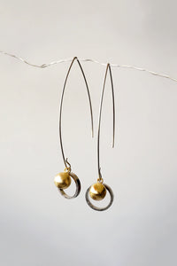 Sleek brass drop earrings featuring elongated hooks accented with polished metallic spheres and delicate circular rings. The mixed gold and silver tones create a modern, fluid silhouette with subtle movement and understated elegance.