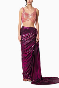Featuring the Tia Gold-Fuschia Blouse with Liquid Kaai Skirt by 431-88's Enfant Terrible collection. The Tia Blouse is hand-embroidered with 3D sequins, featuring a deep V neck and curved hemline. Paired with the Liquid Kaai Skirt's elegant asymmetric drape and high side slit for graceful movement.