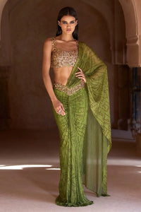 Forest green heiroglyphic print draped skirt saree paired with a fully stone embellised embroidered blouse.