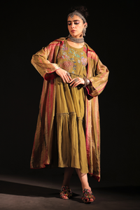 Elevate your wardrobe with this distinctive and versatile ensemble. The tie-dye shirt cape sets the tone with its artistic flair, combining bold colors and patterns that catch the eye. Paired with the gathered dress featuring an embroidered yoke, this outfit seamlessly blends bohemian charm with sophisticated elegance. The dress's gathered detailing adds texture and dimension, enhancing its flattering A-line silhouette.