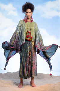Create a bold, vibrant look with this Tie-Dye Poncho Cape featuring a round neck, paired with a pleated uneven skirt and inner. Crafted from a luxurious cotton-silk blend in Teal, Green, and Pink, this set offers a perfect mix of elegance and contemporary style