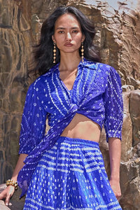 Crop shirt in tonal blue with placement bandhani and ombré detailing. Band collar with a concealed placket and self-tie knot detail at the front. Three-fourth bishop sleeves with elasticated cuffs. Made in natural, breathable viscose. Lined at the front and back. Each piece is unique in colour and pattern as the bandhani tie & dye is a hand-done process.