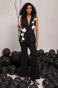This sleek black blazer features a sleeveless design and a front button closure, making it a modern staple. The 3D floral detailing on the front adds a unique and stylish touch, elevating the look. Paired with black straight pants, this ensemble exudes sophisticated elegance with a contemporary edge.