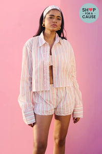 Our Tijara Shirt is designed using striped cotton fabric. It features a two-piece collar, cropped length, full sleeves, and front button closure, for an oversized fit. It pairs well with our Bordi Bralette and Morjim Shorts for a breezy summer look.