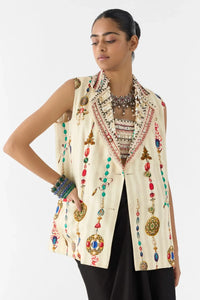The Tijori Blazer crafted from our stunning vegan silk fabrication, trans-seasonal, is a statement piece. This blazer, printed in our jewels tijori print, is sleeveless. With a hand embroidered lapel with lace and beads, it looks chic. It has matching self buttons and is lined. It can be paired with vintage blouse & knot skirt. Wear it with heels for an elegant look.