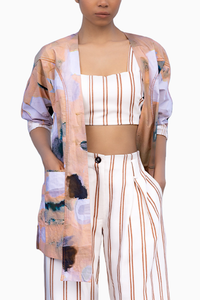 Introducing the Tile Overlay Jacket, a statement piece that combines neutral colors and bold print. The cotton poplin overlay features long lapels and back with elastic cinching, creating a flattering silhouette. The full sleeves are lined with soft striped chanderi, while the detailed top stitch and pockets add functionality. Elevate your wardrobe with this versatile and stylish jacket. Length: 30 inches