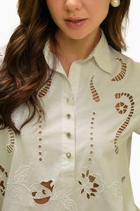 Featuring Tinsley White Shirt by Kay Kay from Sunset and Palms collection. Tinsley white skirt adorned with exquisite detailing, complemented by stylish sleeve accents for a sophisticated look.
