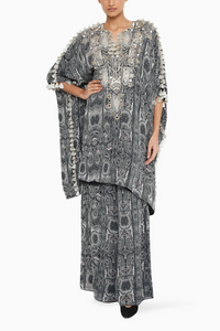 Featuring Black And Pink PS Print Crepe Embroidered Yoke Kaftan With Palazzo