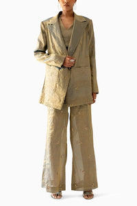 Exude sophistication and elegance with our blue tissue Blazer set. The hand-embroidered oversized blazer features a unique blend of tissue fabric, while the accompanying half-lined pants add a touch of glamour. Elevate your style with this luxurious and eye-catching ensemble.