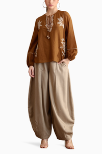 Featuring Tobacco Applique Embroidered Co-ord Set by Nikasha from Garden Of Eden Collection. Tailored in Cotton silk with appliquè embellishments highlighted with beads on the placket and handmade organdy flower tassels. Paired with a contrasting fawn baggy pants in rayon moss further accentuated with mirror detailing.
