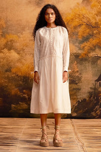 The Tobira Dolman Dress exudes a quiet elegance with its relaxed fit and artful detailing. Crafted from embroidered chanderi, it features graceful dolman sleeves and delicate gathers at the waist, creating a soft and flowing silhouette. Paired with a coordinating slip, this versatile dress strikes the perfect balance between comfort and sophistication. Its timeless design makes it a wardrobe staple that effortlessly flatters and captivates.
