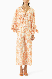 Bright orange on white printed toile de juoy scenes on a kaftan top and wide legged pant. V-neck front and decorative tie-ups on the sleeve cuffs. Paired with wide-legged pants. Elasticated at the back and pockets on the side.